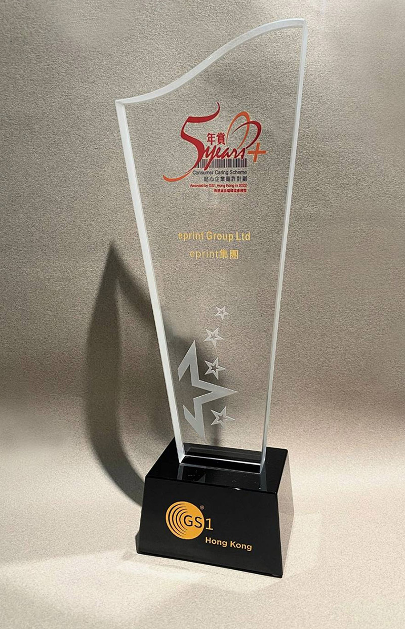 e-print一直堅守「以客為先」的宗旨,貼心滿足客戶需要,在客戶中建立了優質信心品牌的形象。集團已經連續六年獲得GS1 Hong Kong「貼心企業」認證,今年更獲GS1 Hong Kong頒發「貼心企業5年賞」標誌,表揚集團過去一年信守承諾,提供優質產品與服務為消費者帶來良好的體驗,亦為員工提供友善的工作環境!
