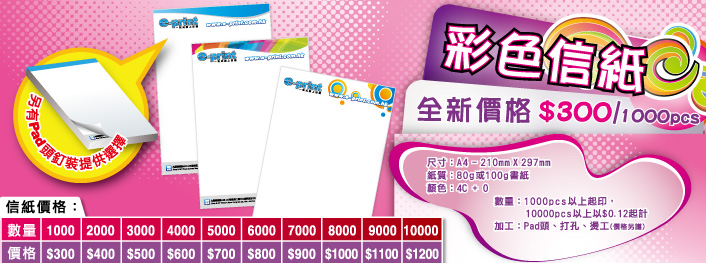 本公司推出信封信紙套餐產品後受到客戶的熱烈支持,產品銷量亦節節上升。為了答謝各位顧客對信封產品的支持,我們特意推出全新低價信紙回饋客戶,彩色信紙1000張低至$300,並提供80g、100g書紙選擇,彩色信封/信紙系列產品,詳情請瀏覽本公司網站。