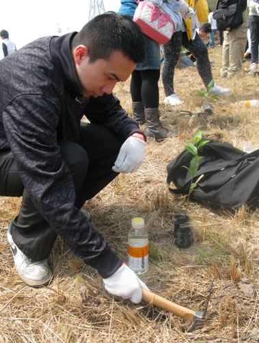 植樹前,同事認真地挖鬆泥土,準備放入樹苗。
