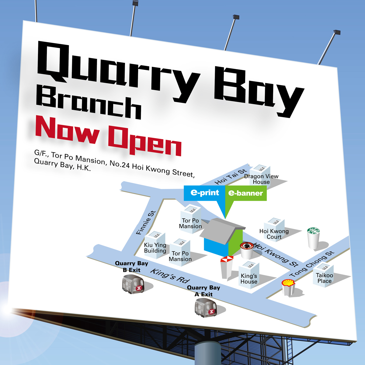 e-print e-banner new branch is opened on 23rd May, 2016. The shop is located at Ground Floor, Tor Po Mansion, No. 24 Hoi Kwong Street, Quarry Bay, Hong Kong. Customers could now order and pick up e-print e-banner products at Quarry Bay shop.