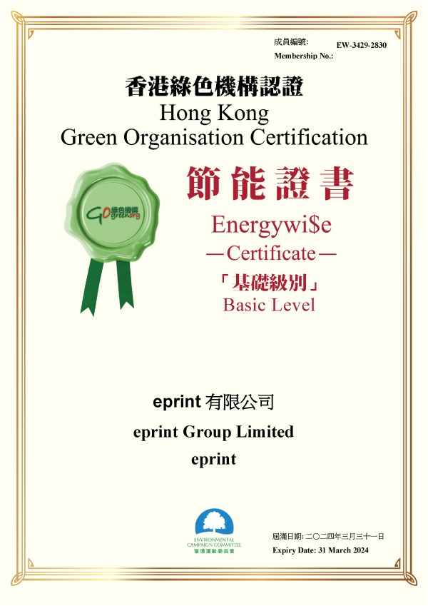 Engergywi$e Certificate” is one of the Certificates under HKGOC which recognize companies / organisations for their commitment to and efforts in environmental protection through energy conservation. eprint Group Limited has fulfilled the requirements of the Certificate (Basic Level) and is authorized to use the Engergywi$e logo.
