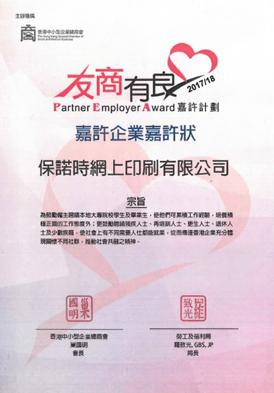 e-print 一直鼓勵印刷業吸納新血,多年來聘請不同院校的大專生,並向大專生提供實習機會,使學生可累積工作經驗,培養他們在印刷業的技巧,增加工作態度和信心。e-print獲邀出席11月17日「友商有良」嘉許典禮,並獲由勞工及福利局局長羅致光頒發2017/18《友商有良─嘉許企業嘉許狀》,表揚過去一年在推動教育事務及履行社會責任的貢獻。