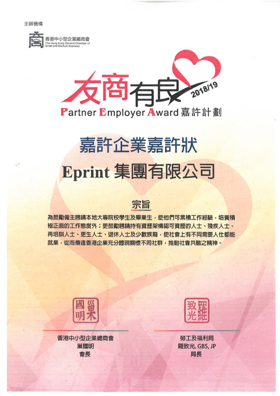 e-print 一直支持大專生,多年來聘請不同院校的學生,向他們提供實習機會,培養他們在印刷業的經驗,增加工作態度和信心。e-print獲邀出席10月12日「友商有良」嘉許典禮,並獲由勞工及福利局局長羅致光頒發2018/19《友商有良─嘉許企業嘉許計劃》。e-print獲嘉許為「友商有良」企業,肯定了推動教育事務及回饋社會作出的努力。來年,e-print會繼續履行社會責任,推動社會共融的精神。