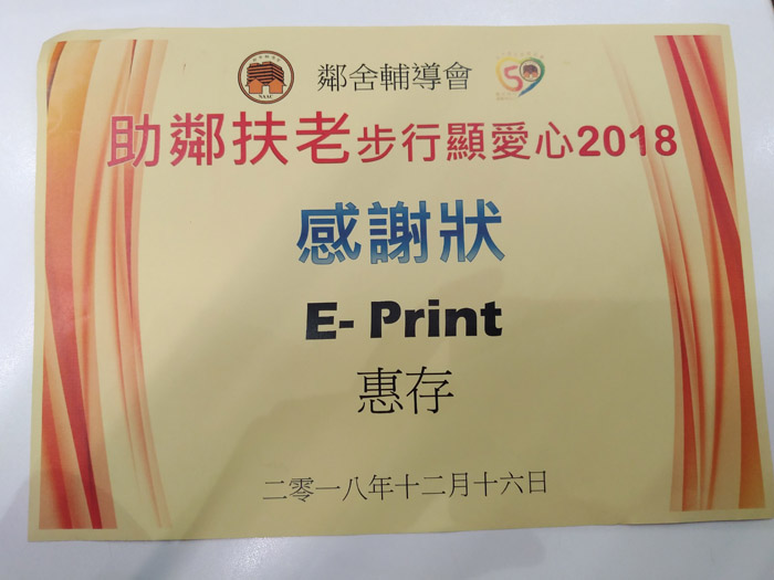 協助老弱社群,eprint 集團旗下員工於2018年12月16日(星期日)參與鄰舍輔導會舉辦的助鄰扶老步行顯愛心2018。是次活動的主要籌款對象為獨居長者、殘疾人仕等,以支援他們的生活所需。