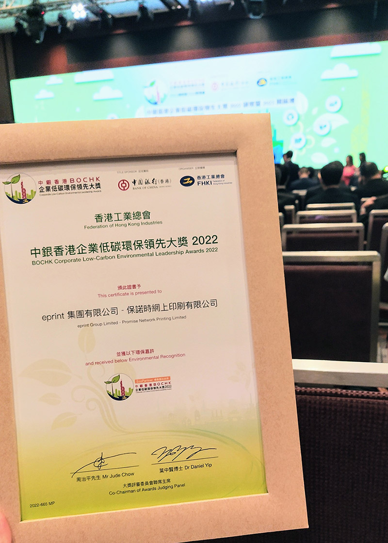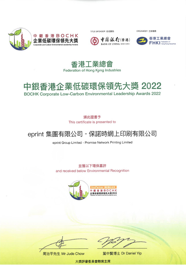 保諾時網上印刷有限公司(e-print)於2023年8月8日出席中銀香港企業低碳環保領先大獎2022頒獎暨2023開展禮,並榮幸再度獲得環保傑出伙伴的嘉許,以表揚公司在環保方面一直不遺餘力。