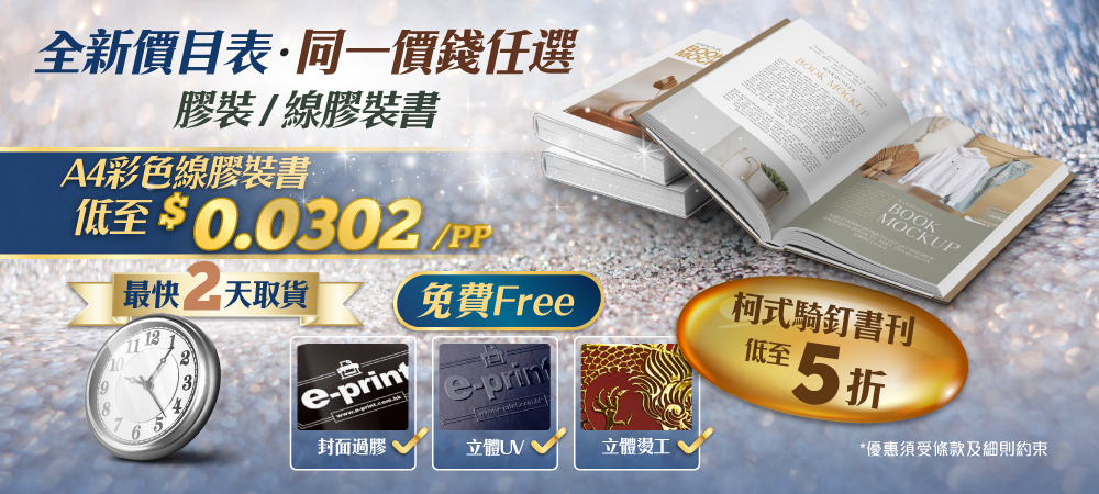 膠裝書、線膠裝書:1-50000本 8折 (A4及A5以內的直度的膠裝書/線膠裝書,可選用80g/100g書紙、128g光/啞粉紙、157g光/啞粉紙,封面頁數4PP、內文頁數不限);