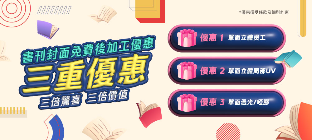 1. 優惠適用於柯式騎釘書刊(10000本內)、柯式膠裝書刊(10000本內)、柯式線膠裝書刊(1000本內)直度的250g雙粉咭紙的封面單面立體局部UV加工費用